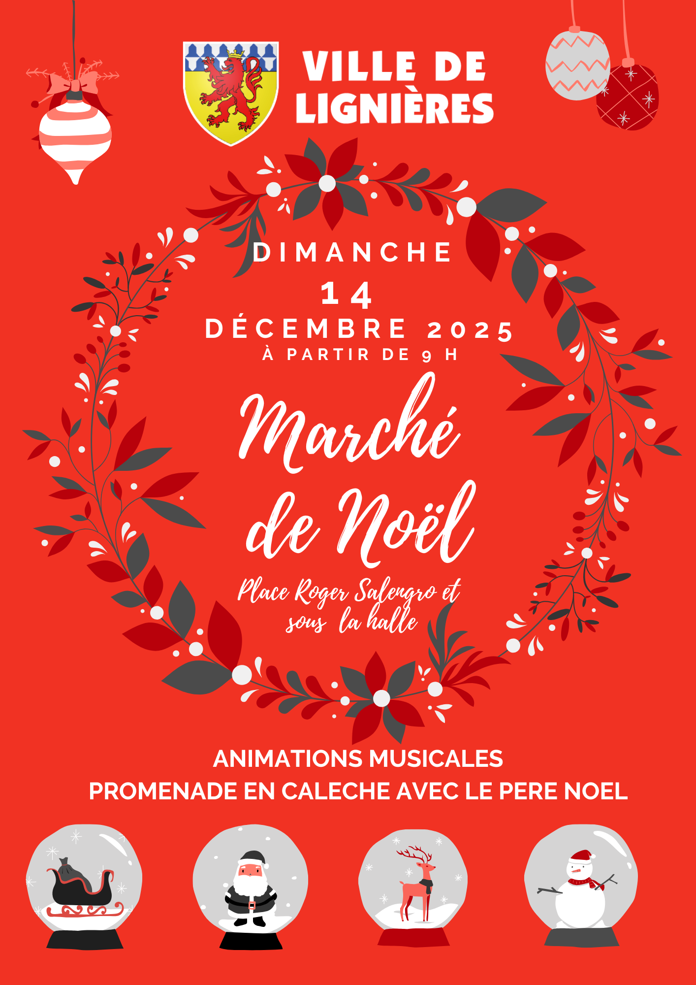 Mis en avant 14 décembre @ 9h00 - 17h00 Ville de Lignières – Marché de Noël Animations Musicales, promenade en calèche avec le Père Noël