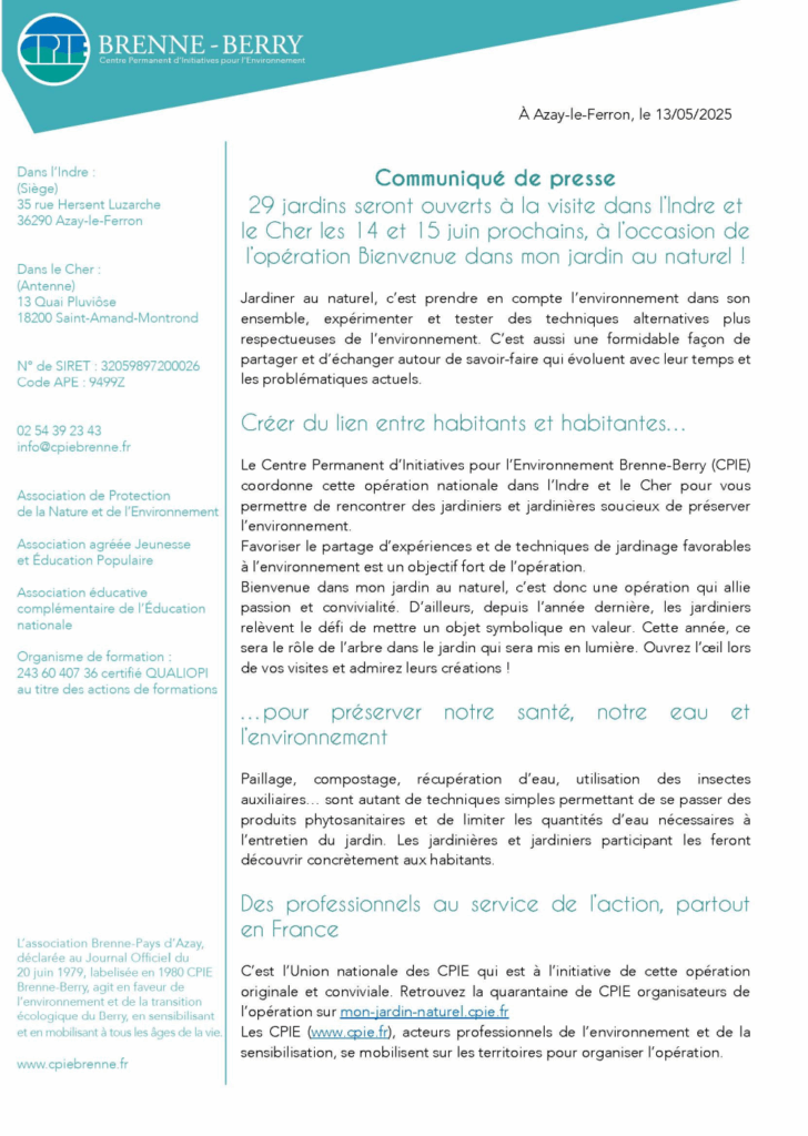 Les 14 et 15 juin prochains, les jardiniers et jardinières du Berry ouvriront leurs portes au public dans le cadre de l’opération nationale “Bienvenue dans mon Jardin au Naturel”. Cette initiative, qui en est à sa nouvelle édition, met en lumière des pratiques de jardinage respectueuses de l’environnement, de la biodiversité et des ressources en eau.