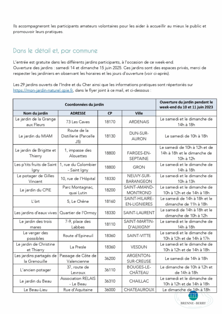 Vous trouverez en pièce-jointe à cet email des informations complémentaires sur l’opération, ainsi que la liste des jardins ouverts au public.
